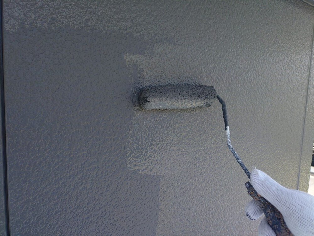 外壁材と塗料との密着性を高める為中塗り材を塗布していきます。 -