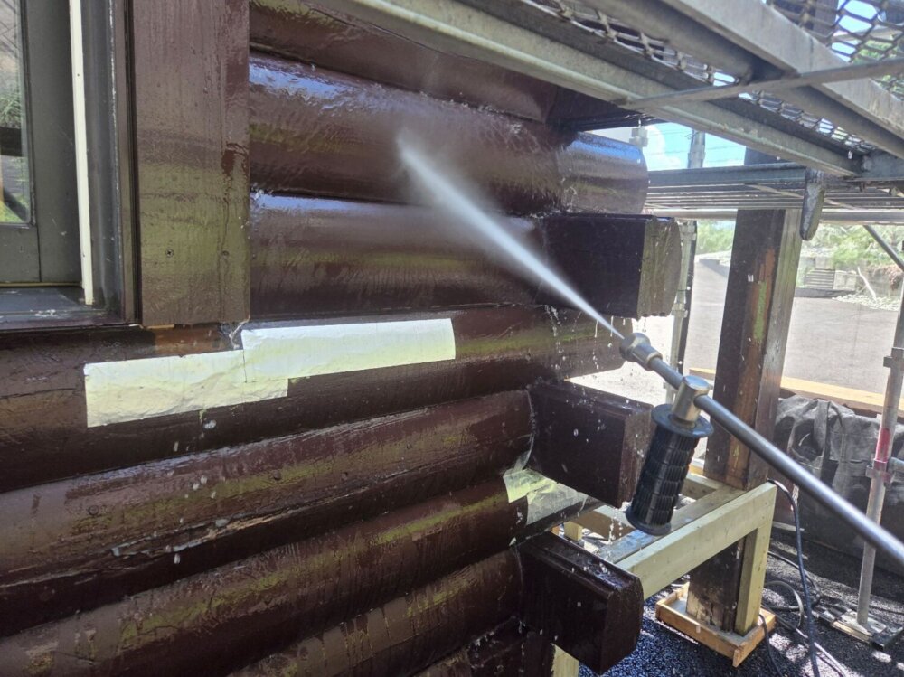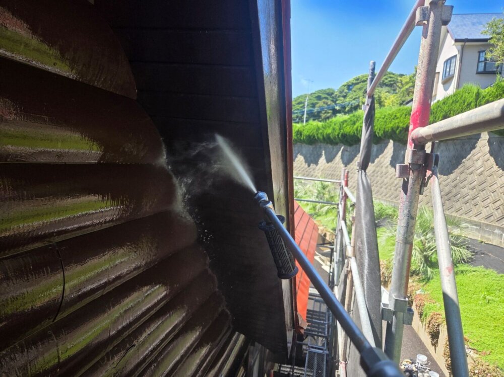 外壁に付着している砂塵、汚れ、苔、藻、カビなどを洗い流し綺麗にする作業になります。 -