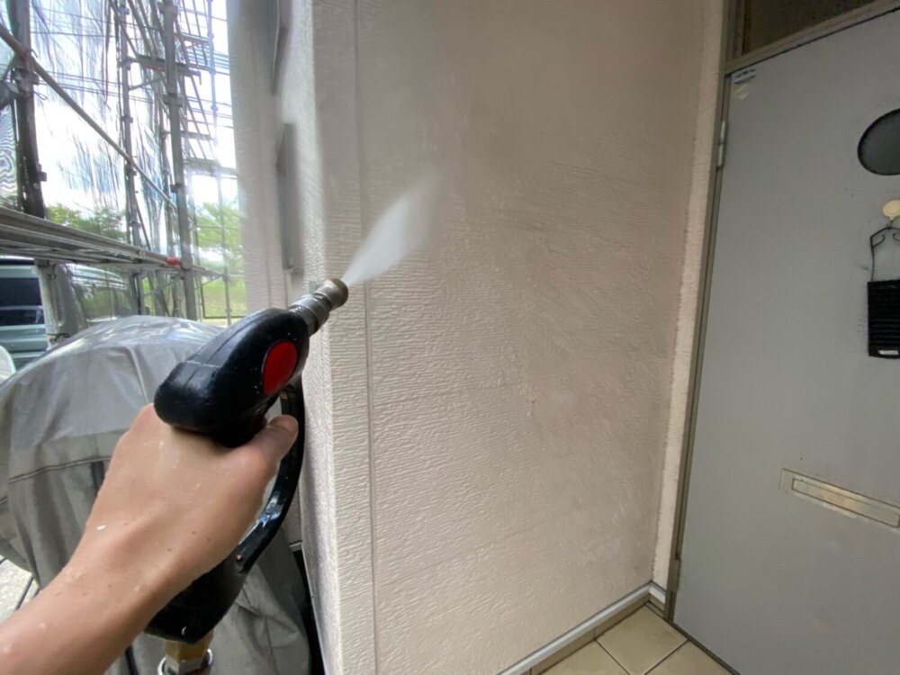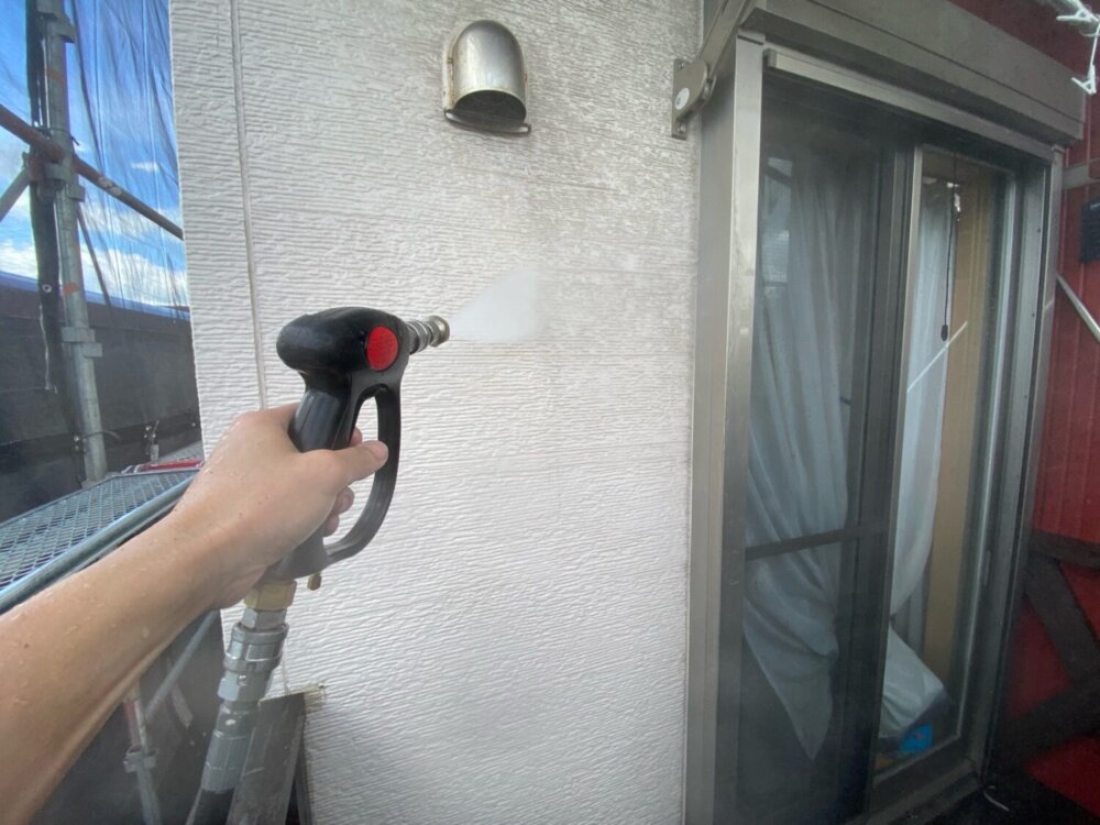 外壁に付着している砂塵、汚れ、苔、藻、カビなどを洗い流し綺麗にする作業になります。 -