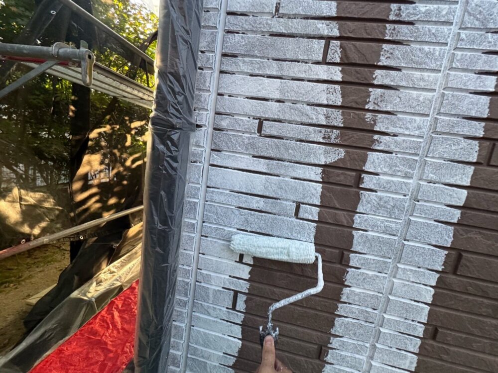 外壁材と塗料との密着性を高める為下塗り材を塗布していきます。 -