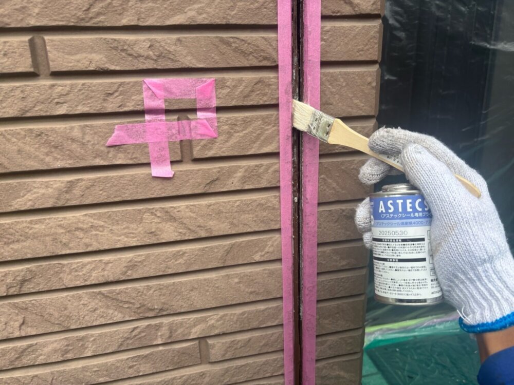 コーキング充填(コーキングを塗っていく)する前に、必ずプライマー(接着剤)を塗っていきます。