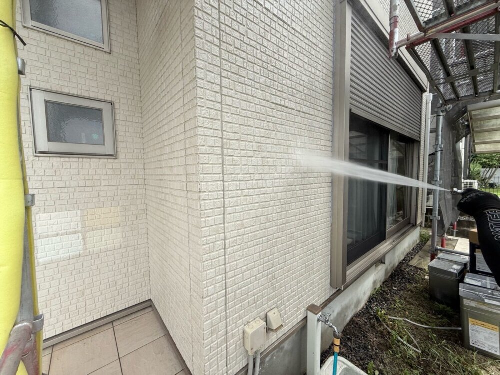 外壁に付着している砂塵、汚れ、苔、藻、カビなどを洗い流し綺麗にする作業になります。