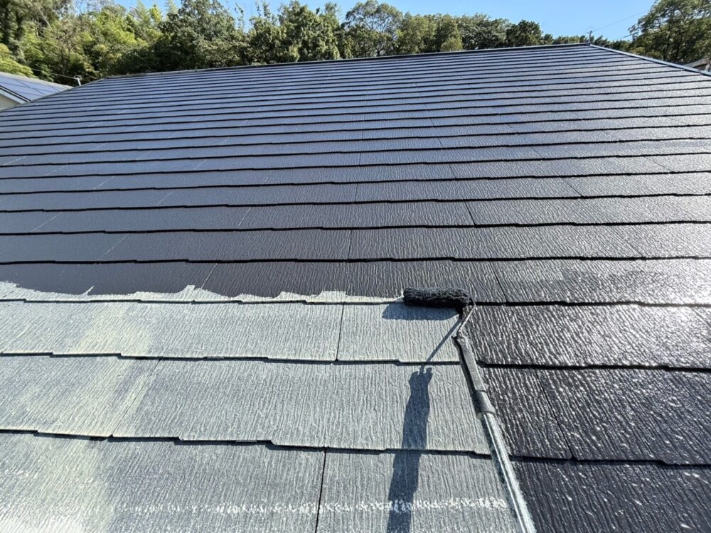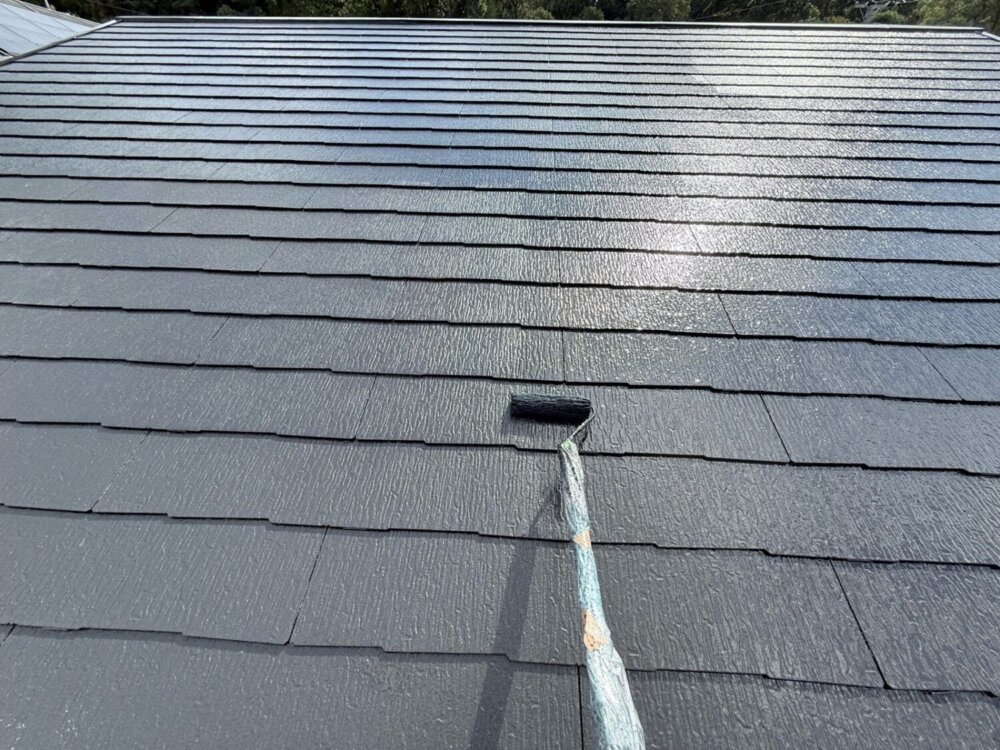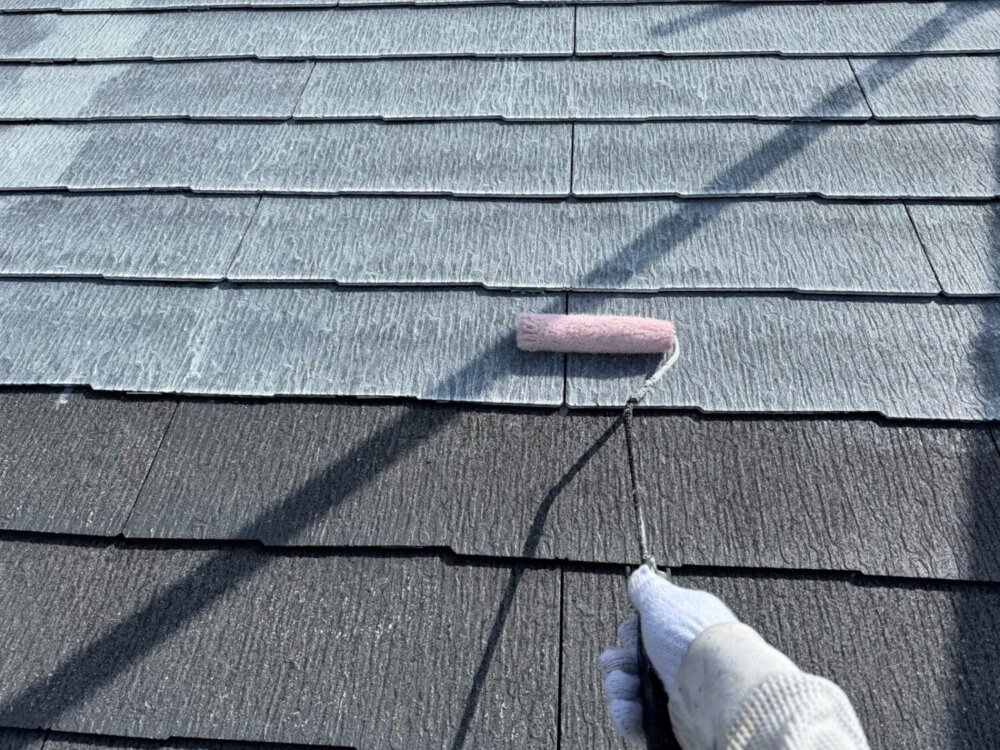 屋根材と塗料との密着性を高める為下塗り材を塗布していきます。