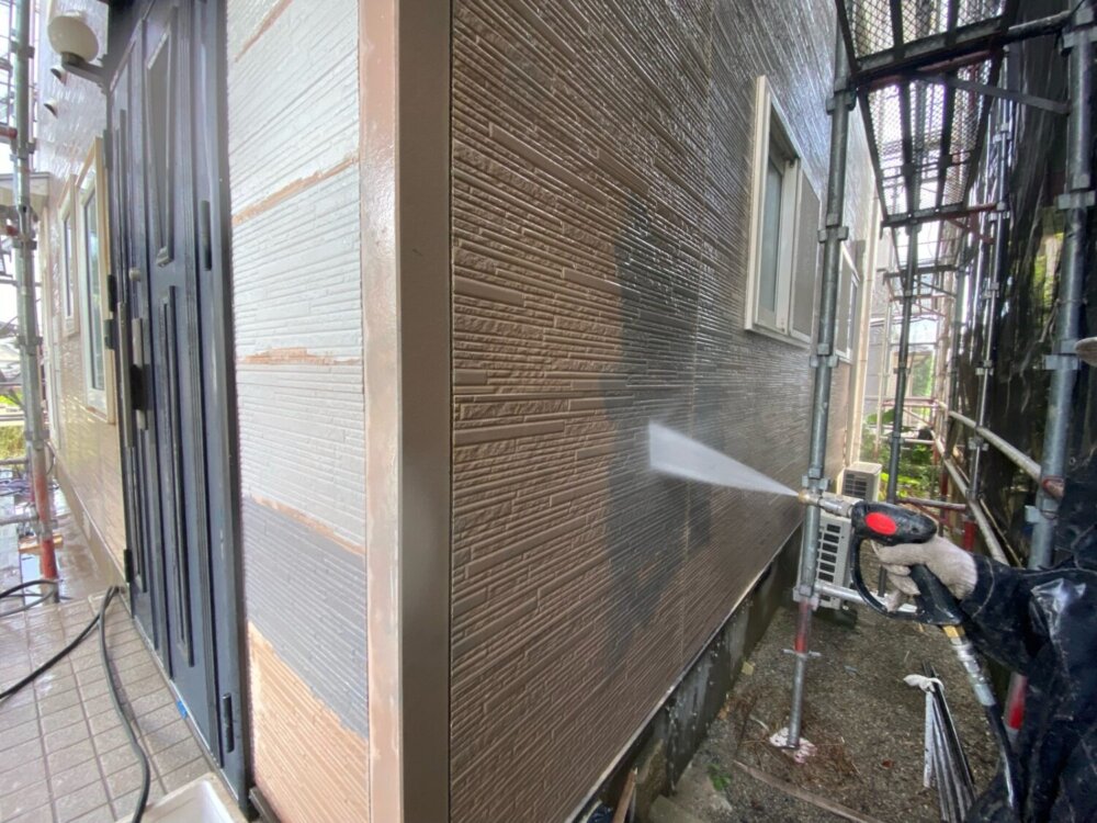 外壁に付着している砂塵、汚れ、苔、藻、カビなどを洗い流し綺麗にする作業になります。 -