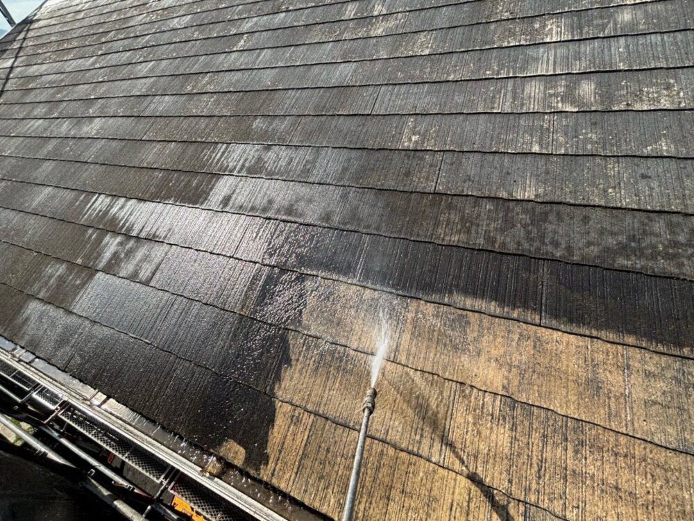 屋根に付着している砂塵、汚れ、苔、藻、カビなどを洗い流し綺麗にする作業になります。 -
