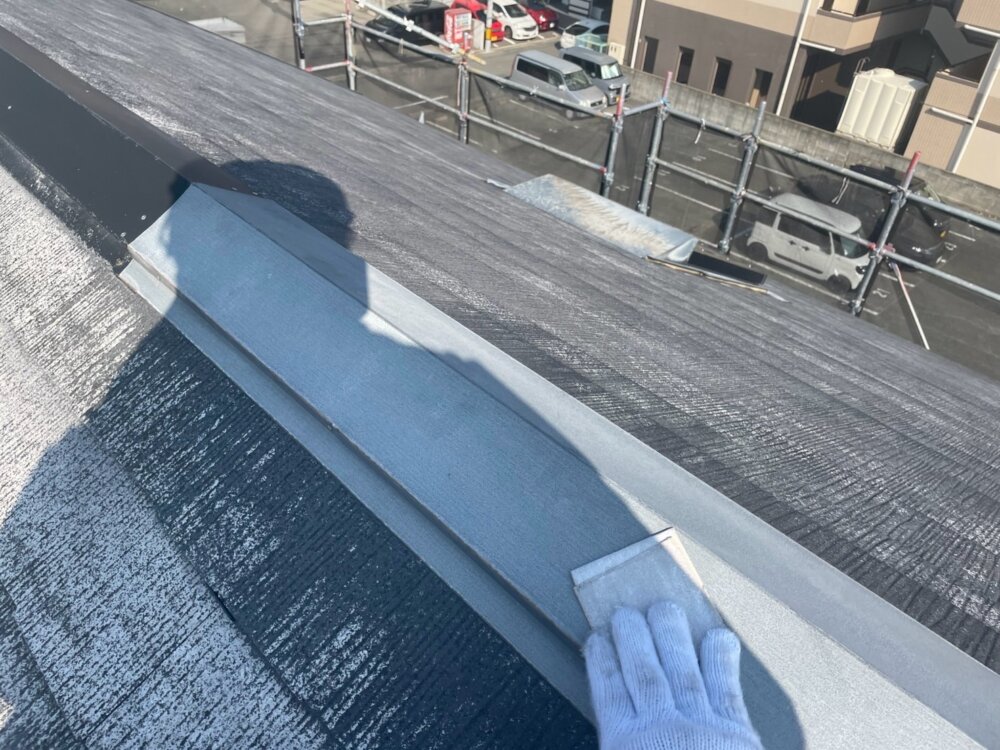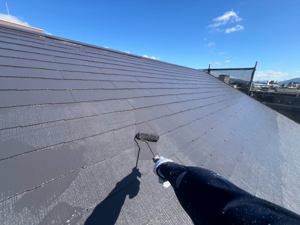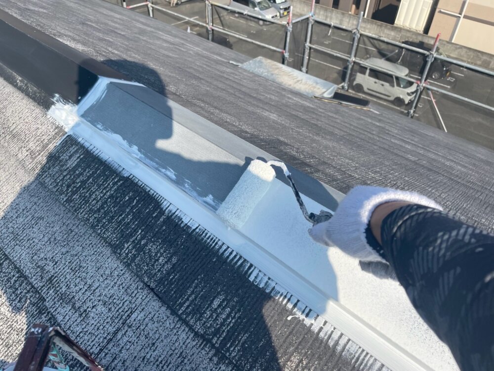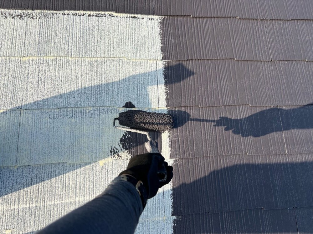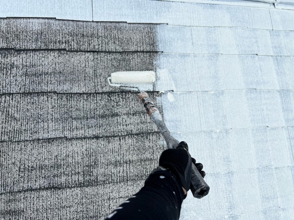 屋根材と塗料との密着性を高める為下塗り材を塗布していきます。