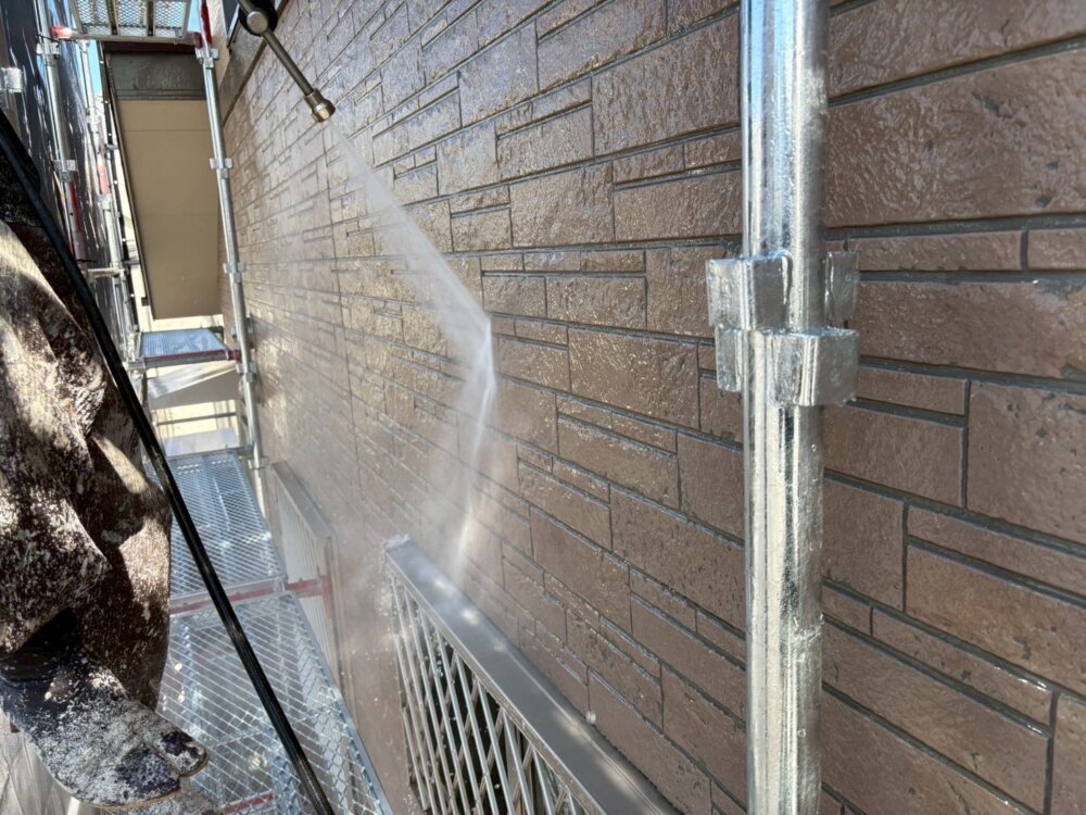 外壁に付着している砂塵、汚れ、苔、藻、カビなどを洗い流し綺麗にする作業になります。 -