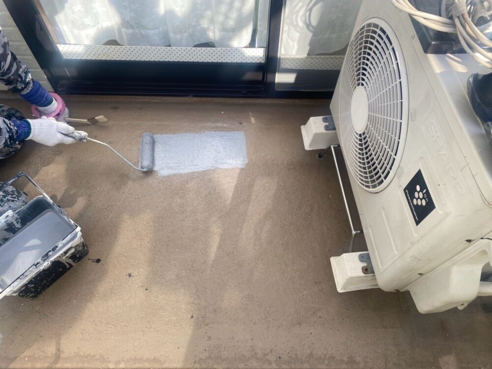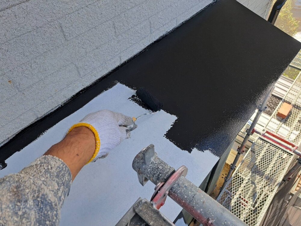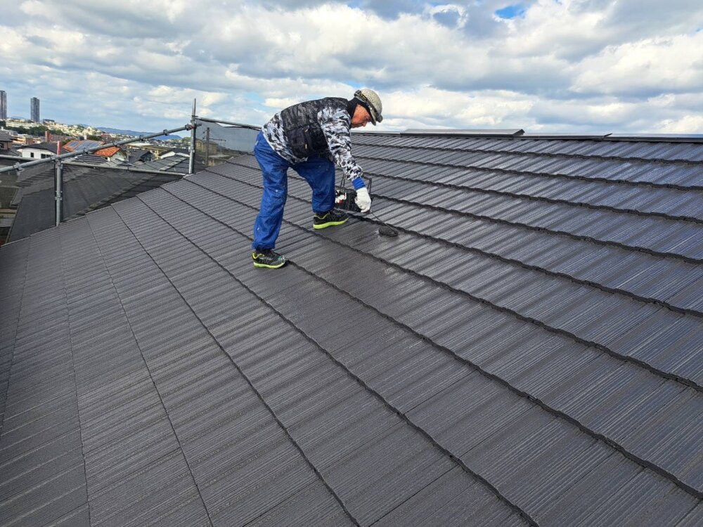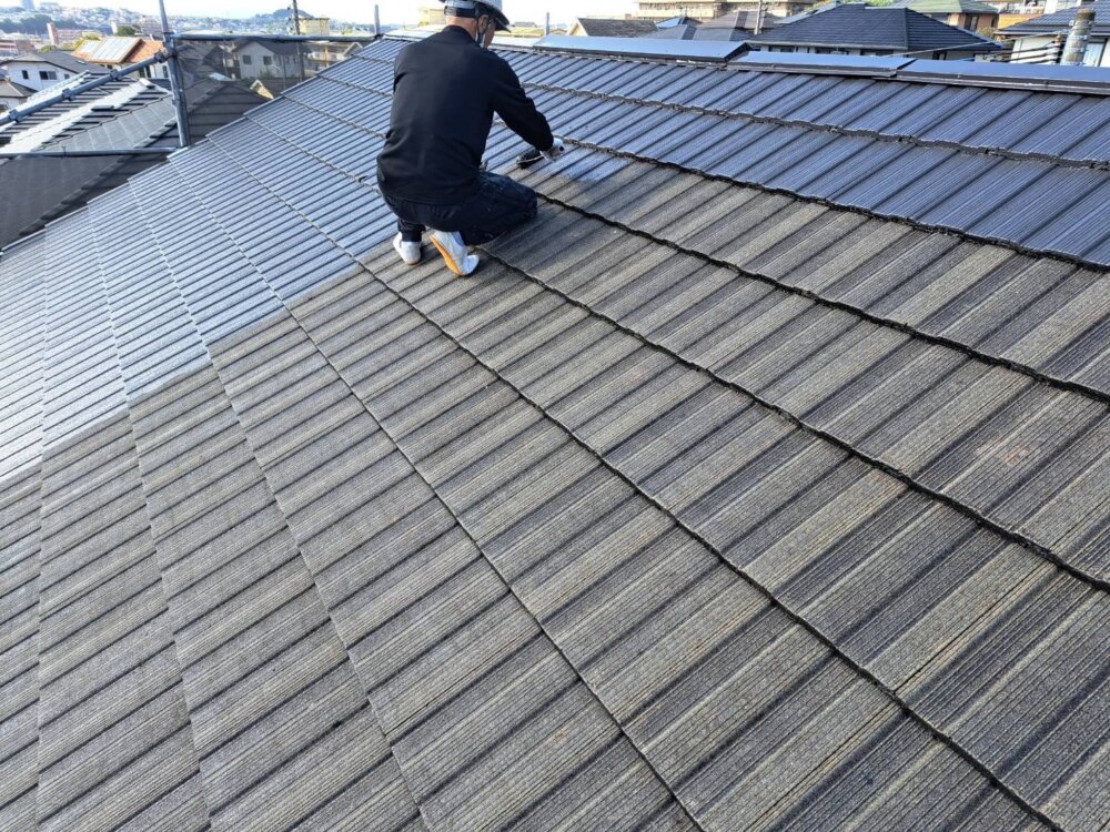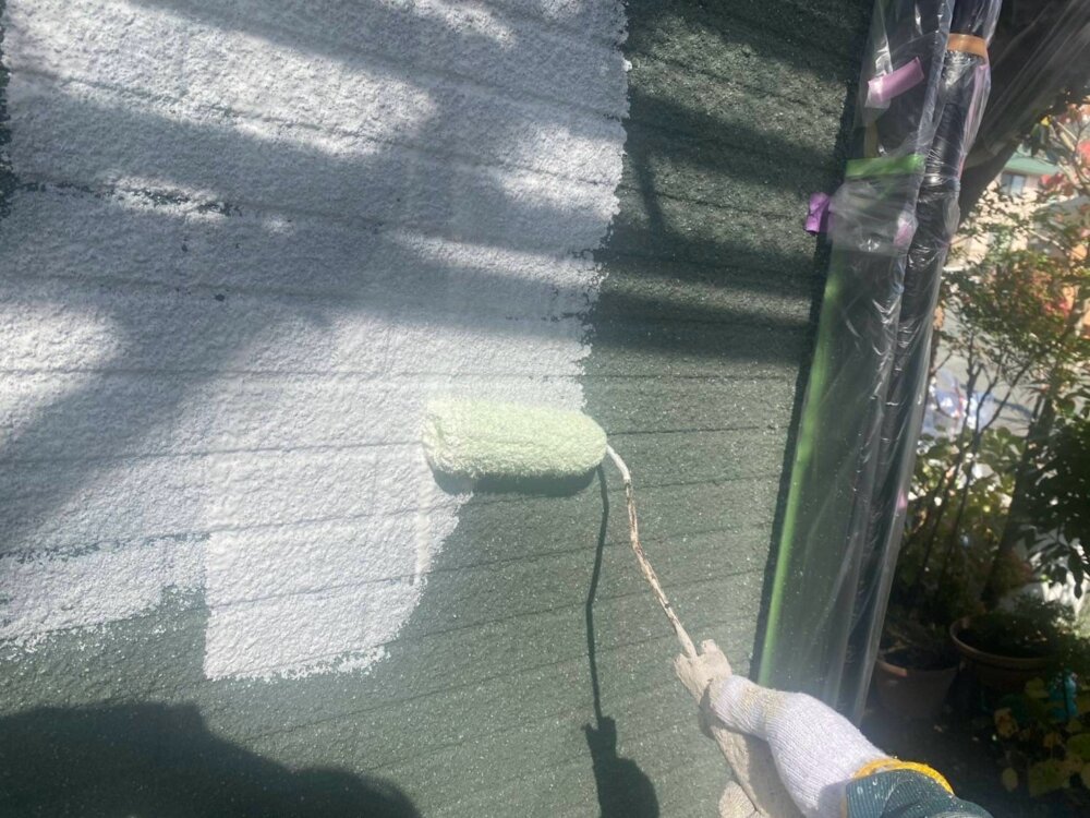 屋根材と塗料との密着性を高める為下塗り材を塗布していきます。 -