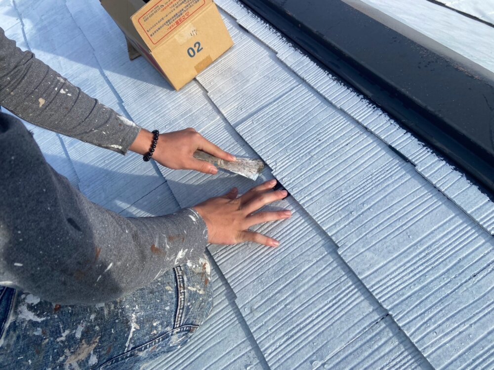 屋根材と塗料との密着性を高める為下塗り材を塗布していきます。 -