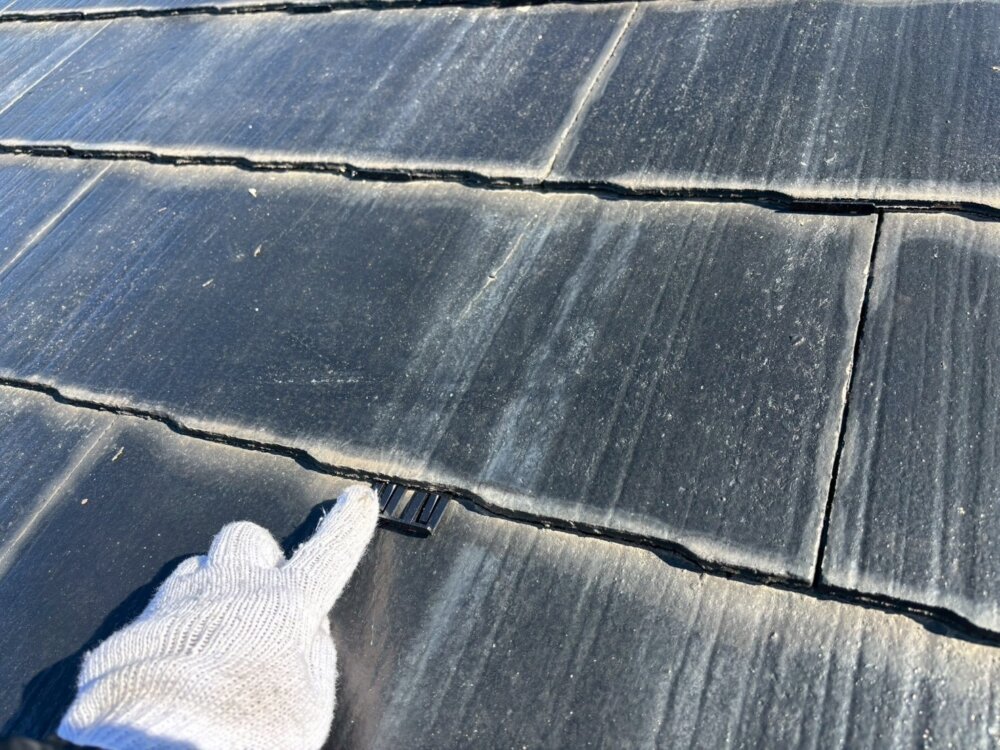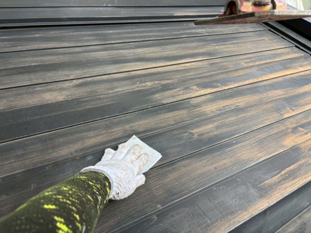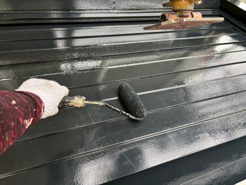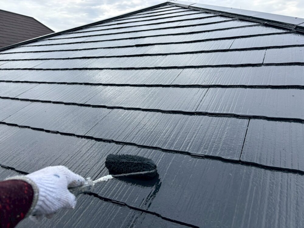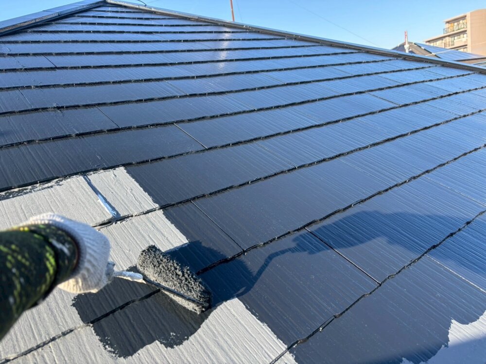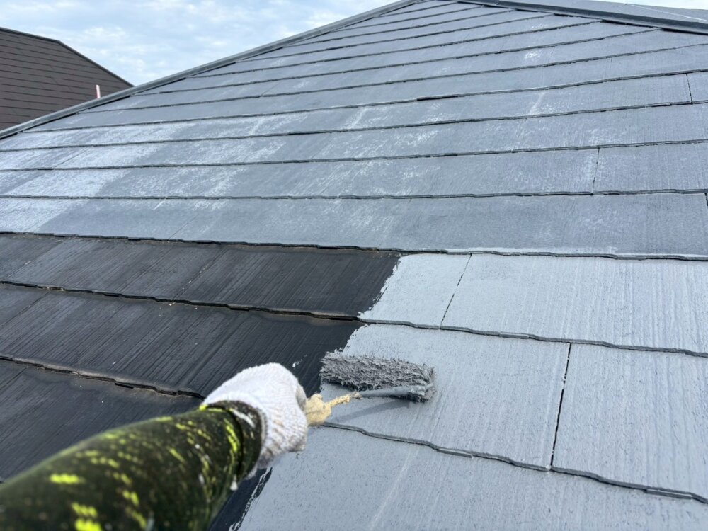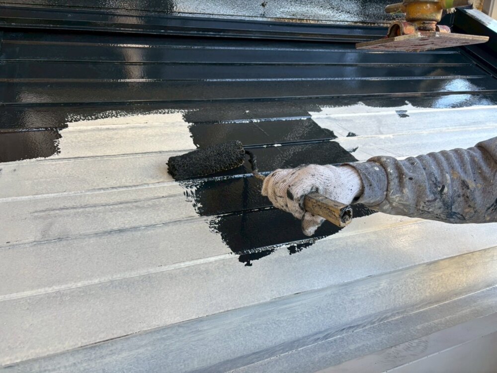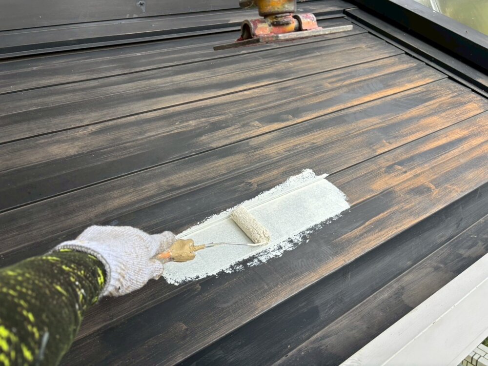 屋根材と塗料との密着性を高める為下塗り材を塗布していきます。