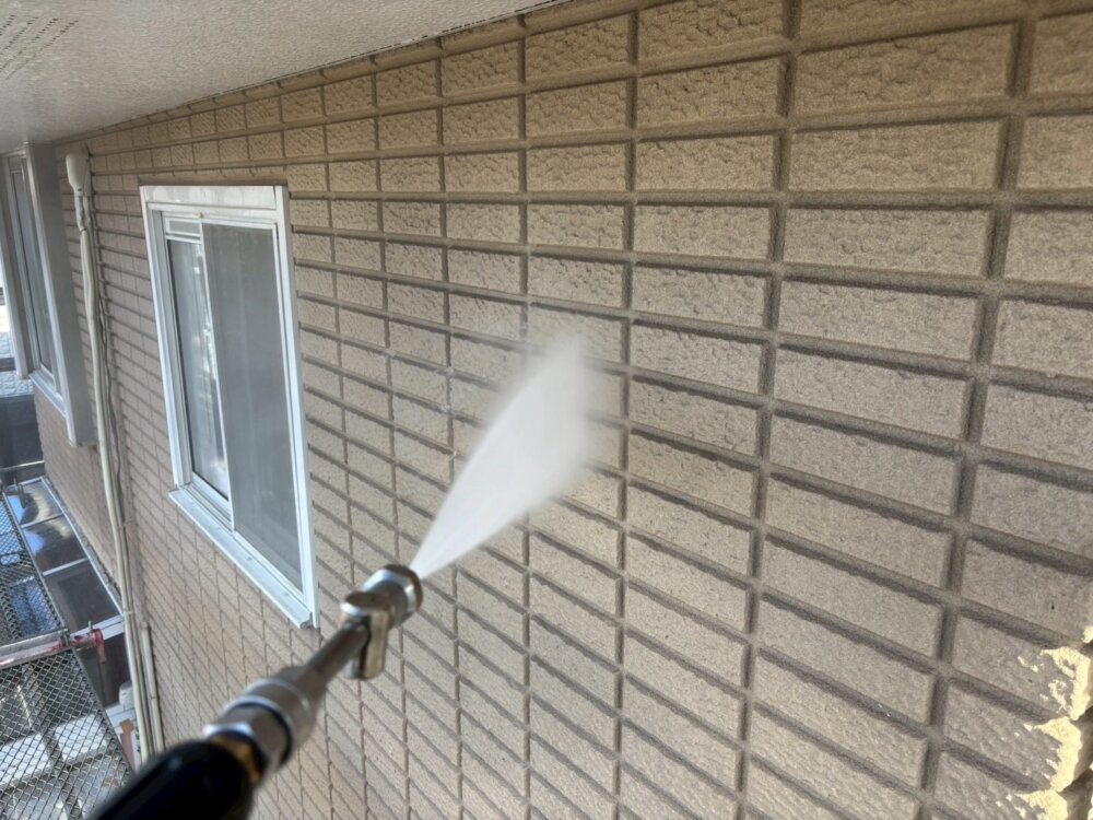 外壁に付着している砂塵、汚れ、苔、藻、カビなどを洗い流し綺麗にする作業になります。