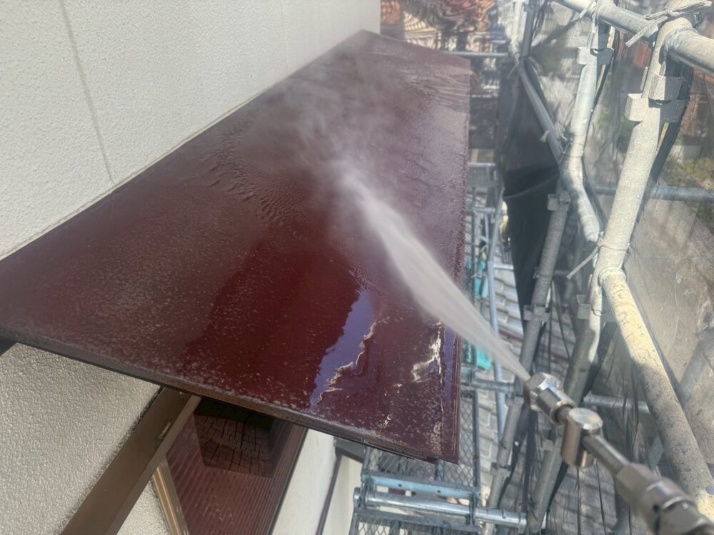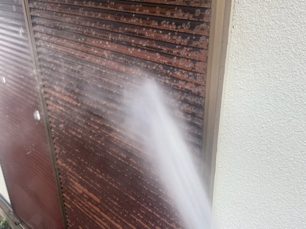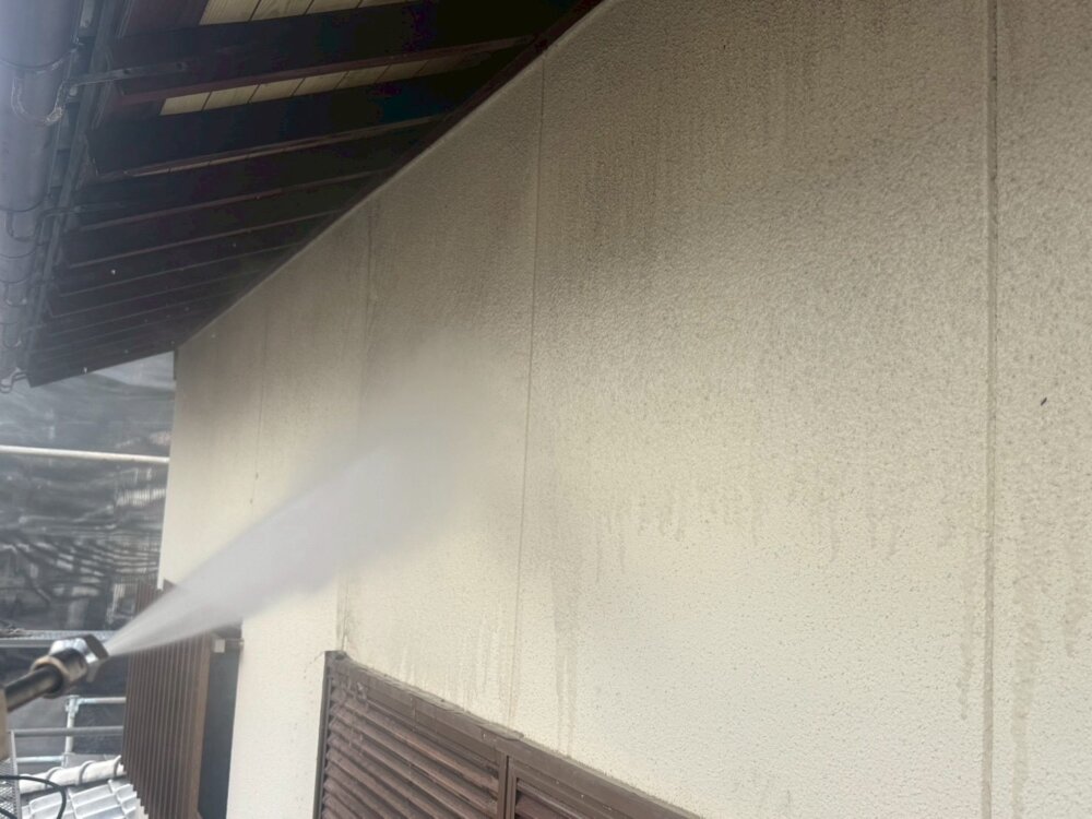 外壁に付着している砂塵、汚れ、苔、藻、カビなどを洗い流し綺麗にする作業になります。 -