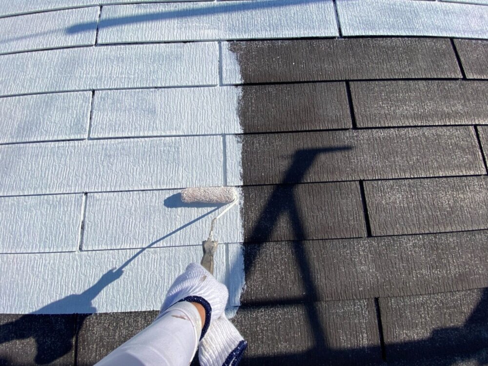 屋根材と塗料との密着性を高める為下塗り材を塗布していきます。 -