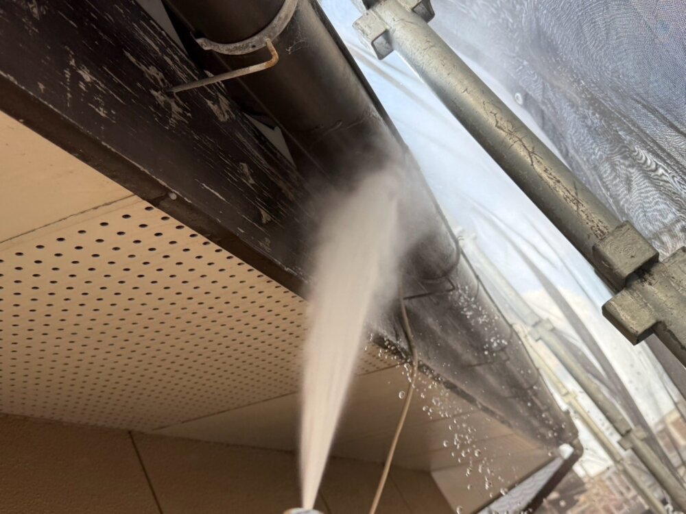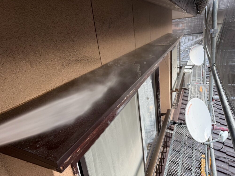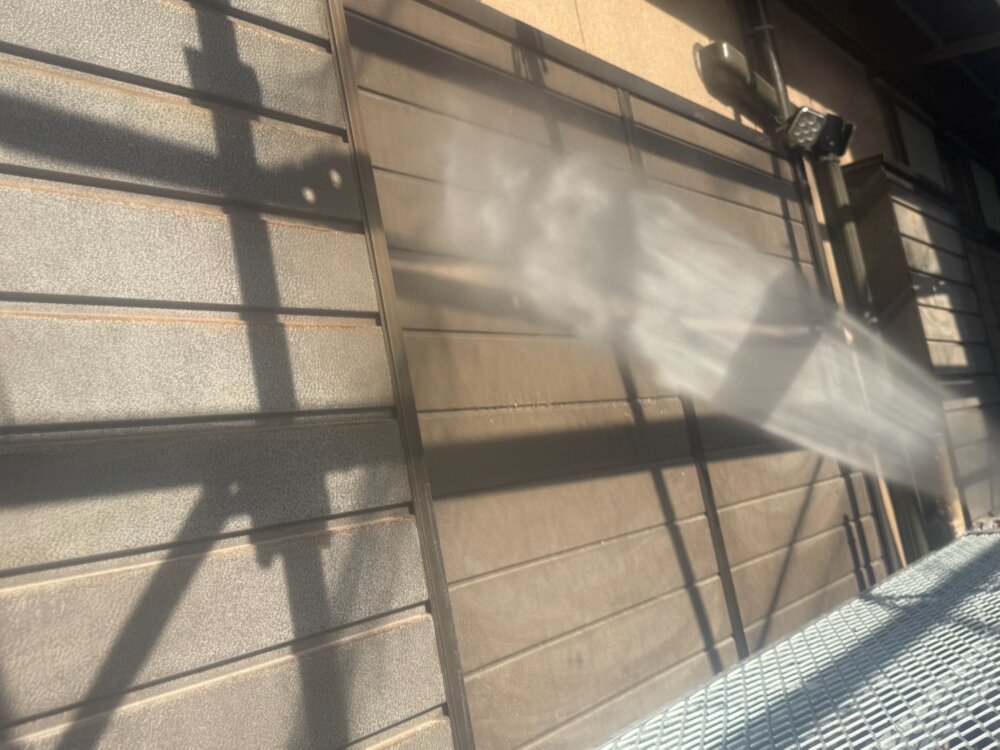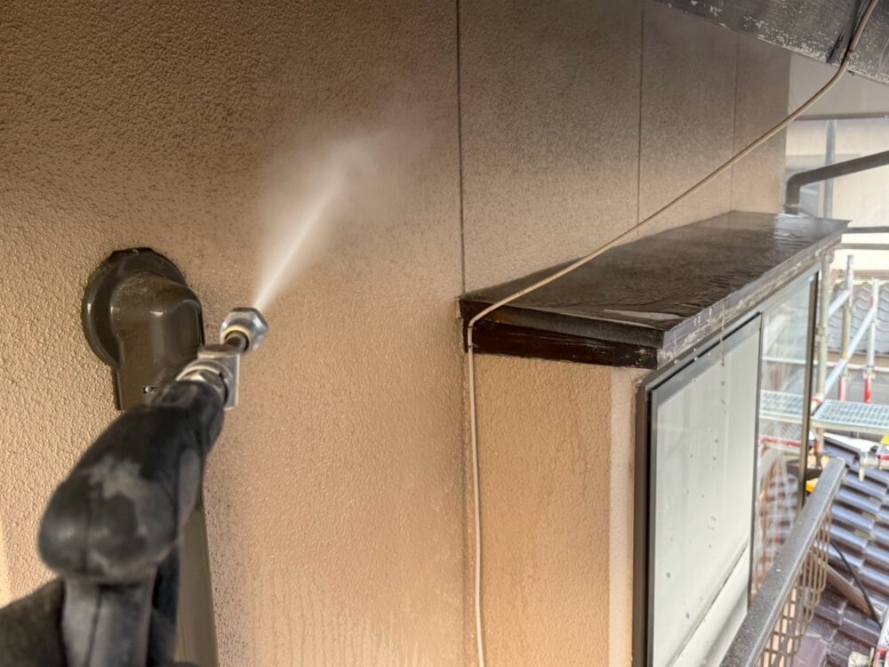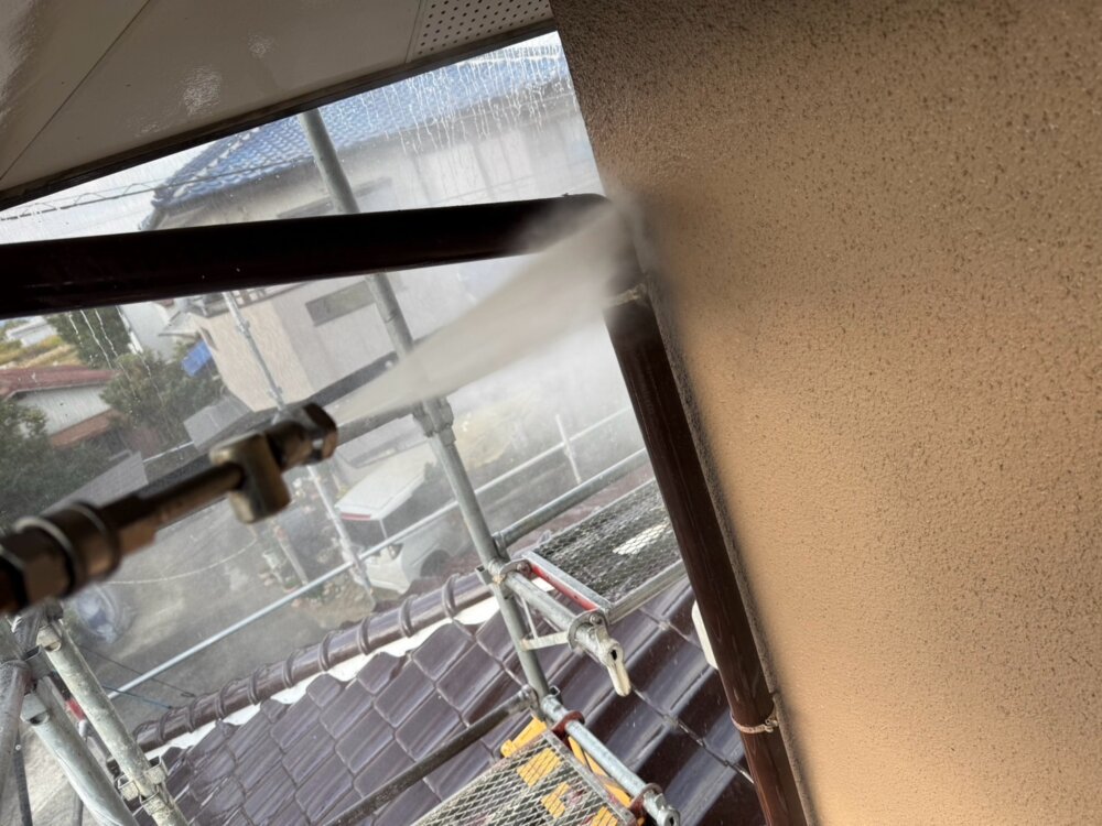 外壁に付着している砂塵、汚れ、苔、藻、カビなどを洗い流し綺麗にする作業になります。 -