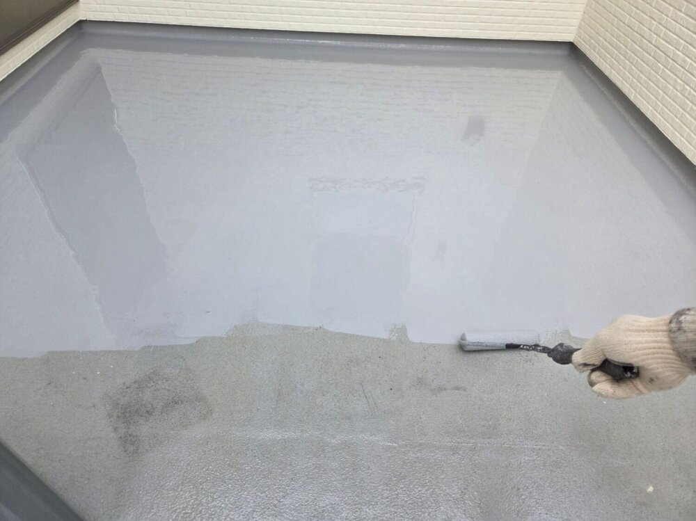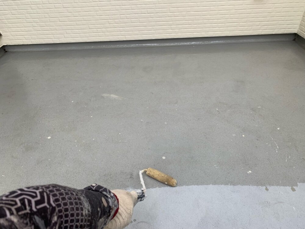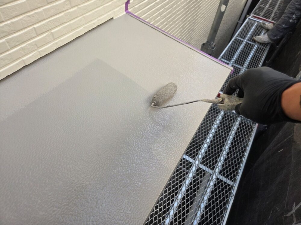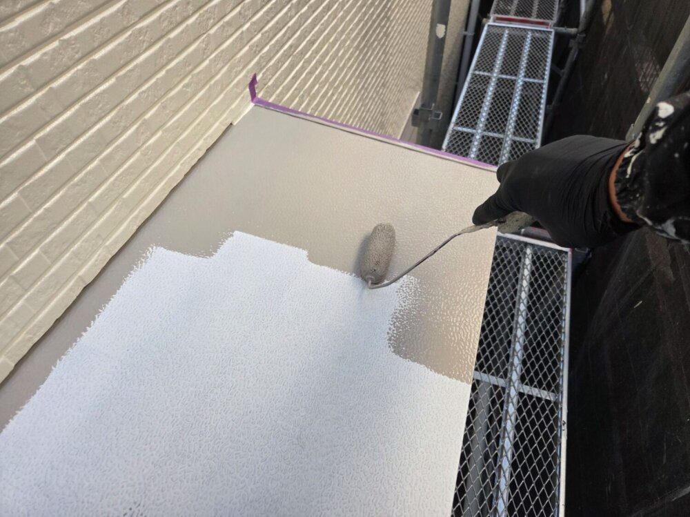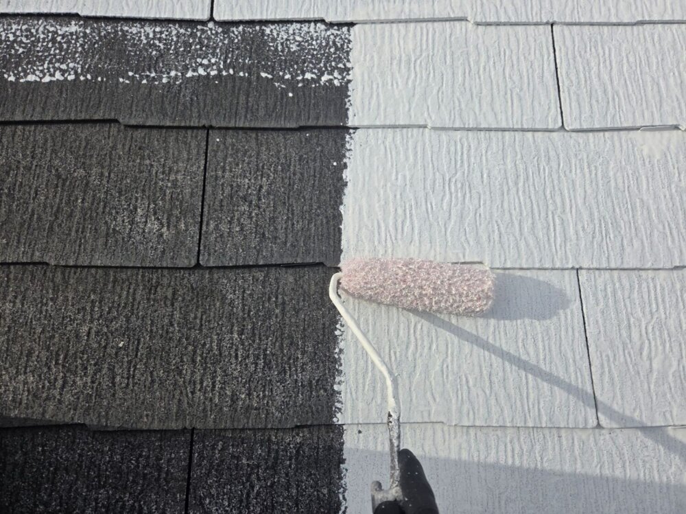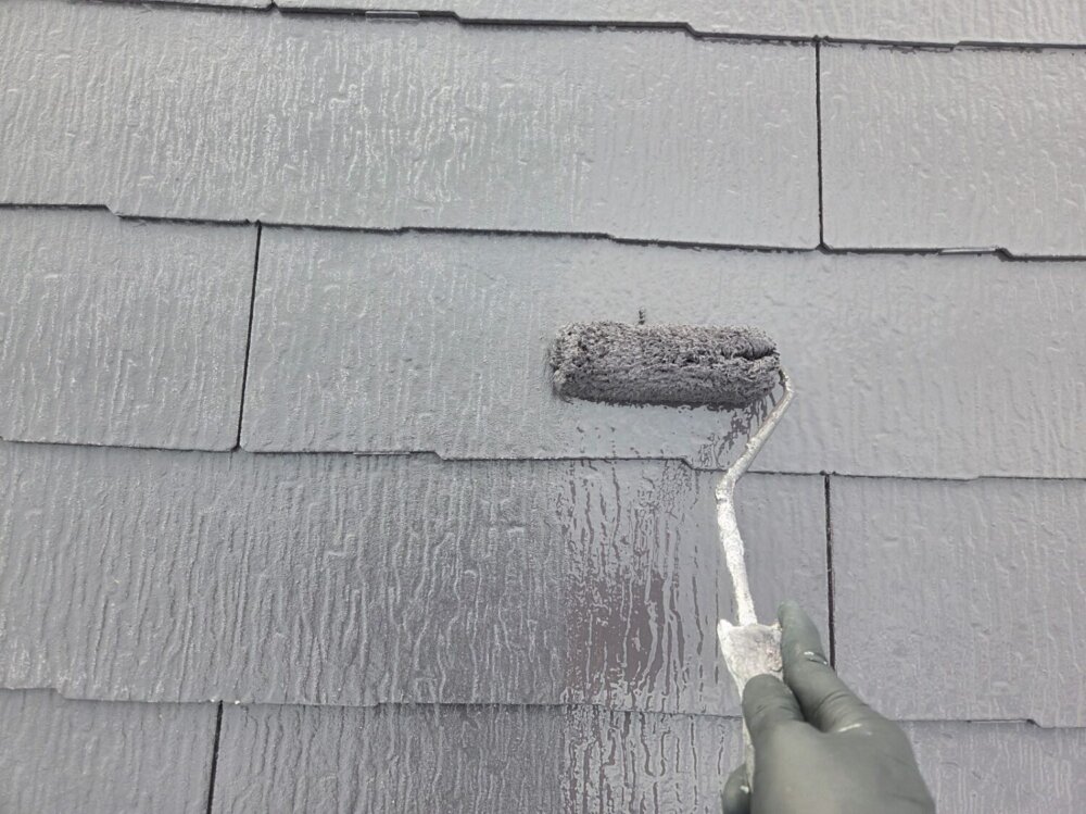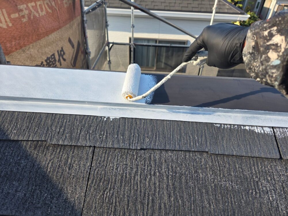 屋根材と塗料との密着性を高める為下塗り材を塗布していきます。