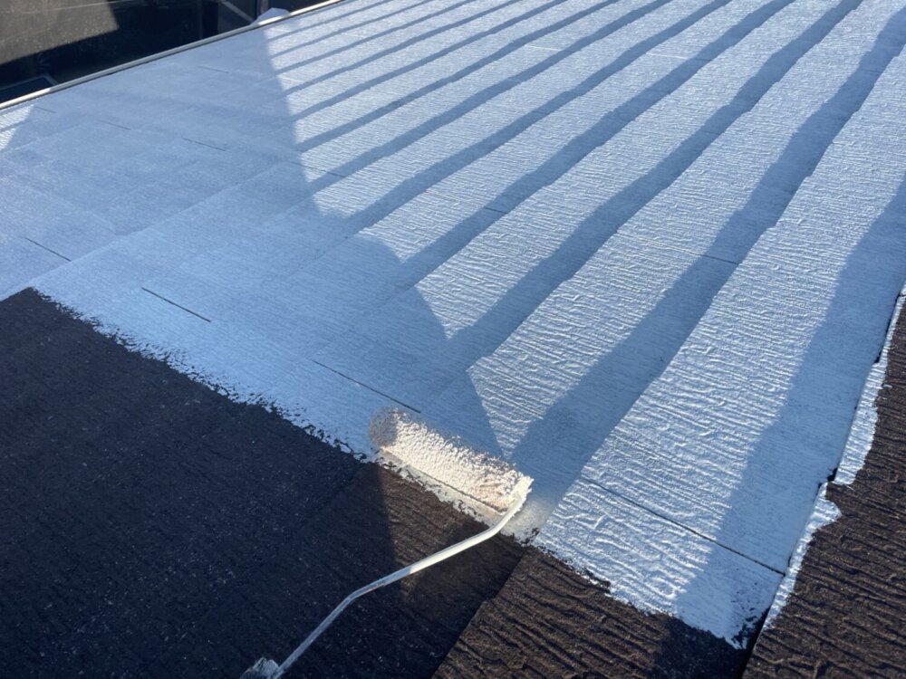 屋根材と塗料との密着性を高める為下塗り材を塗布していきます。 -