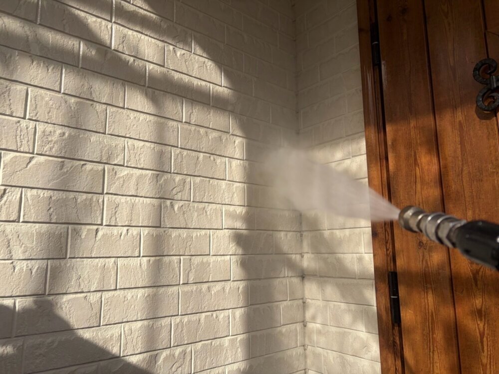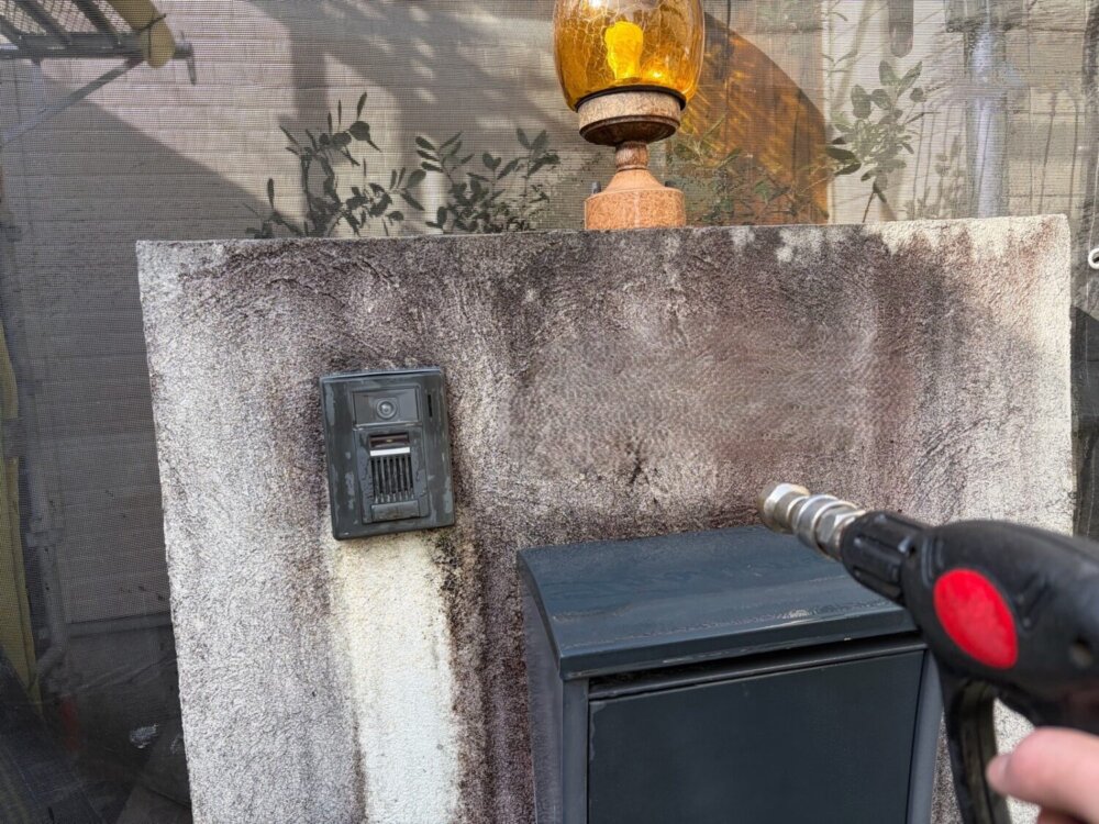 外壁に付着している砂塵、汚れ、苔、藻、カビなどを洗い流し綺麗にする作業になります。 -