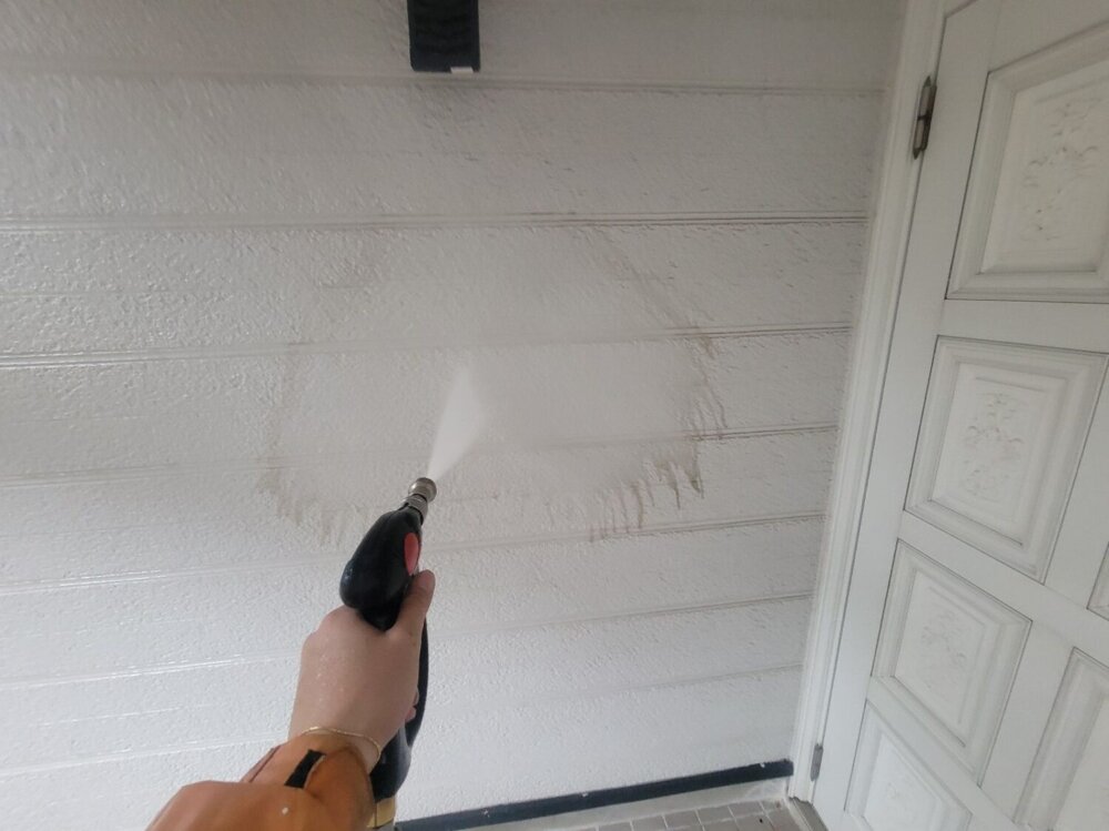 外壁に付着している砂塵、汚れ、苔、藻、カビなどを洗い流し綺麗にする作業になります。 -