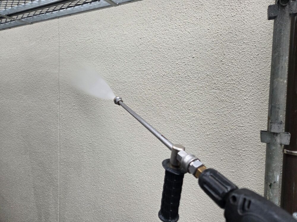 外壁に付着している砂塵、汚れ、苔、藻、カビなどを洗い流し綺麗にする作業になります。 -