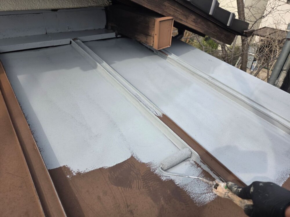 屋根材と塗料との密着性を高める為下塗り材を塗布していきます。 -