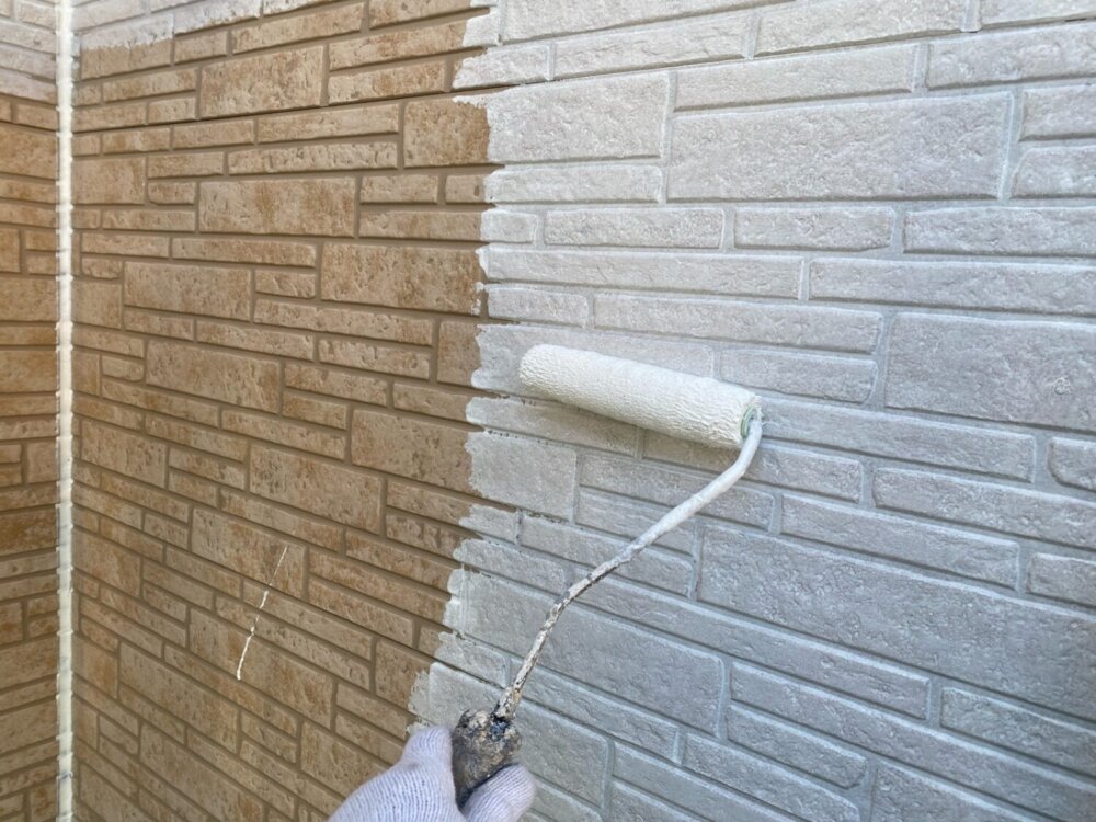 外壁材と塗料との密着性を高める為下塗り材を塗布していきます。